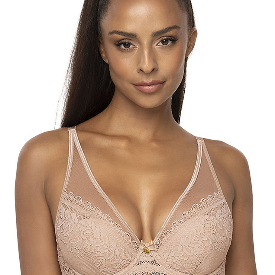 Elegant push-up bra made of floral motif lace. The bra has removable enlargement inserts, the inner side of the cup is lined with cotton. Between the cups a bow with a decorative scroll, lace sides, no side whalebones. Decorative, adjustable straps, not detachable. the extension of the straps is made of mesh. Hook-and-eye closure at the back. Double-row hook and eye with three-step adjustment.